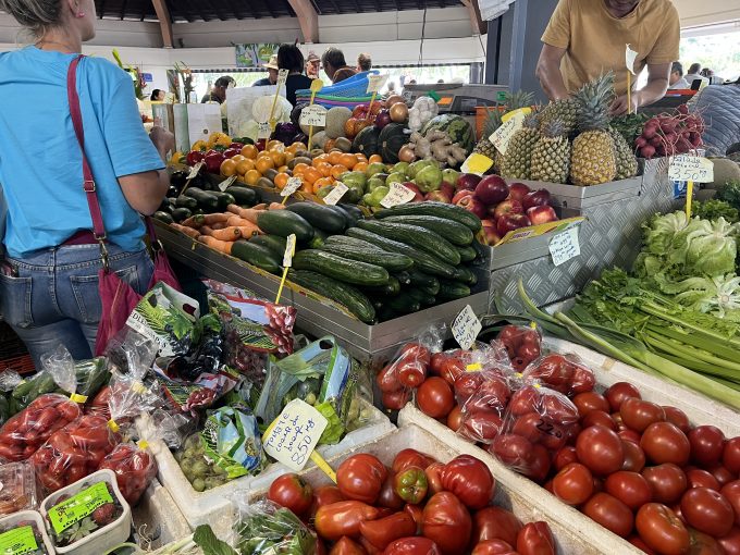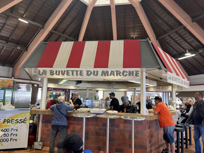 当初、午前中に「メトル島」へ移動する予定でしたが、朝市(マルシェ)が週末に賑わうようなので、ボートの移動を午後に変更。早起きしてローカルバス“Tanéo(タネオ)”で朝市へ。お店も人も多くてとても盛り上がっていました。朝ごはんは、朝市の中にあるカフェ「La Buvette du Marche」でクロックムッシュを食べました。