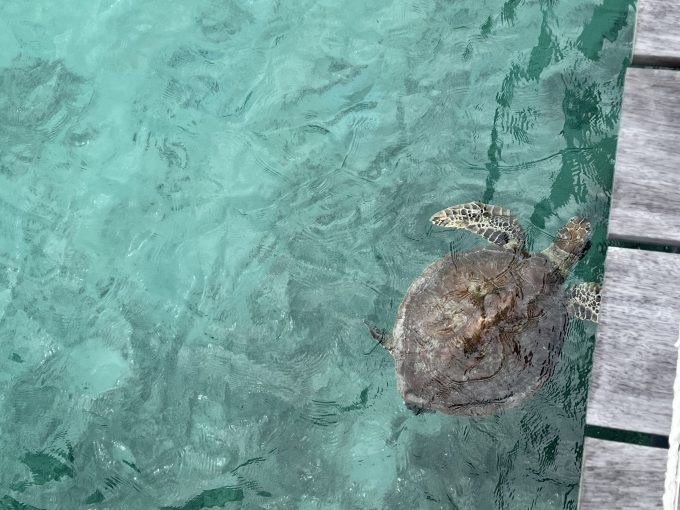 ニューカレドニアに来てまだ一度もウミガメを見られていなかったので、朝食を食べて少し休憩した後、ウミガメ探しへ。皆さんも私たちと同じようにウミガメを探されていたようで、写真を撮っている方のところに行ったらようやくウミガメと会えました!運がよかったのか、この日はこの後もちょこちょこウミガメと会えました。