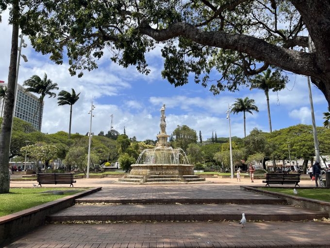 午前中にボートでヌメアへ移動。まずは歩いて「ココティエ広場」へ。ココティエ広場は現地の方がご飯を食べたり、話したりする地元でも憩いの場のようでした。