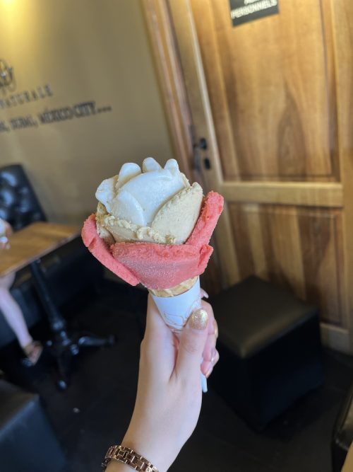 最終日は、バスで朝市に行ったり、「ジョンストン(スーパー)」やショッピングモールでお土産を購入したり、あとフランス発のジェラート屋さん「アモリーノ」でジェラートを食べました。花びらの形に盛り付けてくれて可愛かったです。
