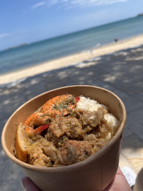 その後、夫はニューカレドニアで着用するシャツを購入し、たまたま向かいの広場でイベントをしていたので見学。そこでパエリアなどをテイクアウトし、ビーチ沿いできれいな海を見ながら、昼ご飯を食べました。