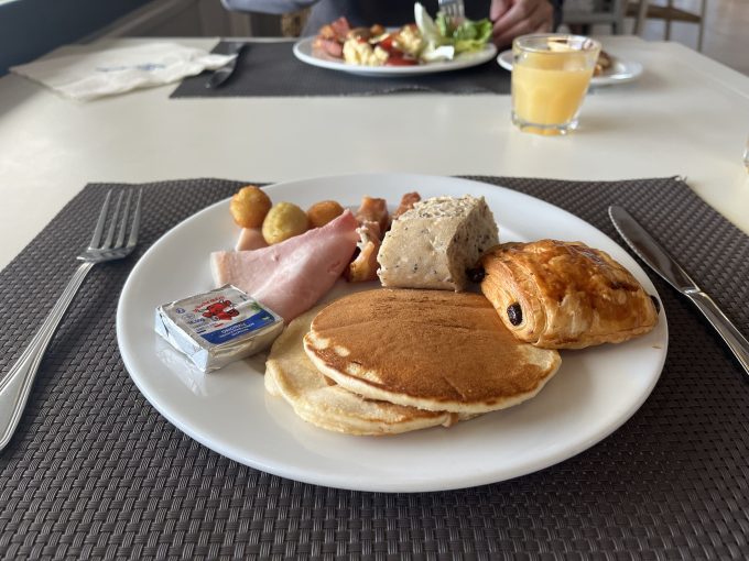 水上コテージは、朝食ビュッフェも種類が豊富でワクワクしました。目の前で焼いてくれるパンケーキがモチモチしていて美味しかったです!