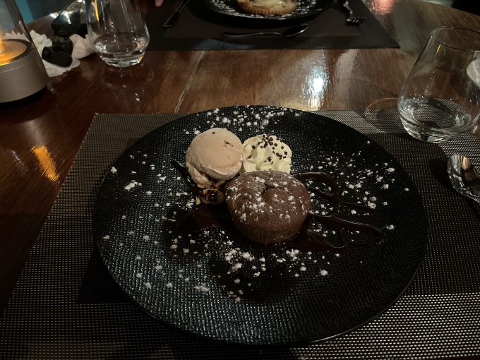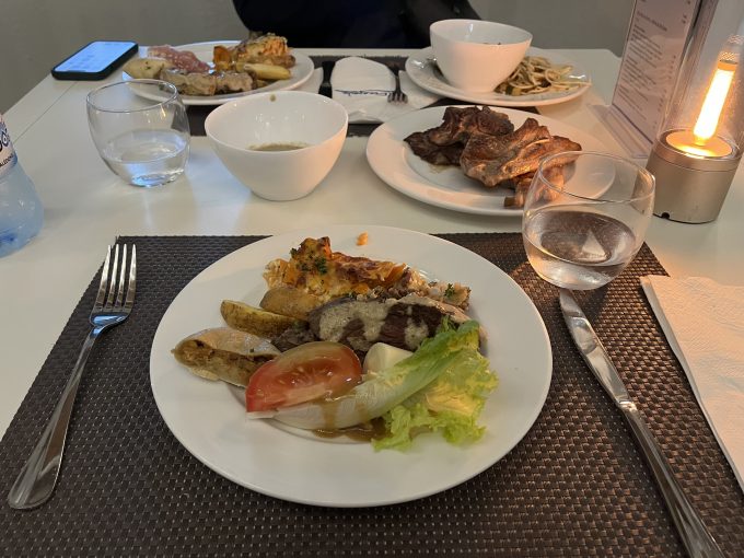 夕飯のビュッフェは肉、魚、サラダ、チーズ、ケーキなど種類が豊富で、目移りするほど。鉄板でお肉を焼いてくれたのですが、とてもゴツくてボリュームがあり、それを見て「海外に来たな」と感じました。