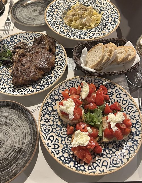 美術館を見た帰り道、来る途中にあったジェラート屋さんがすごく並んでて気になっていたので、そこに寄ってジェラートを食べました。「La Strega Nocciola」というお店でした、とても美味しかったです。いったんホテルに戻って少し休憩してから、夕食はホテルの近くの「Trattoria dell'Oca」へ。フィレンツェ名物のステーキやトリュフのパスタ、カプレーゼをいただき、お腹いっぱいでホテルに戻りました。