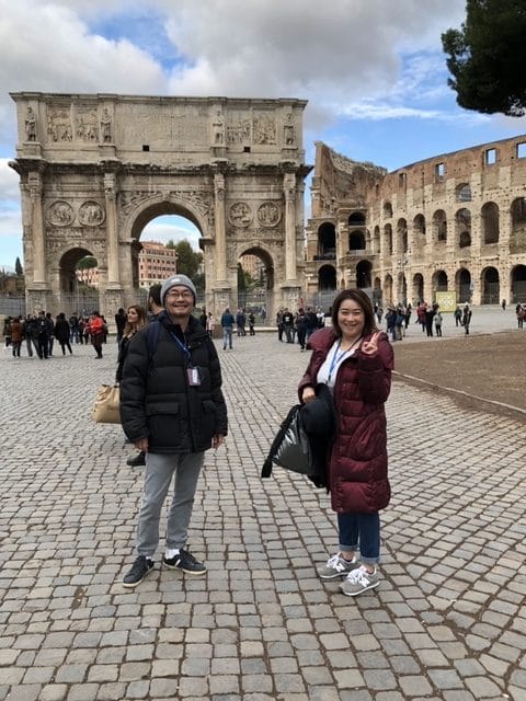 ローマ・コロッセオのそばにある「コンスタンティヌスの凱旋門」にて