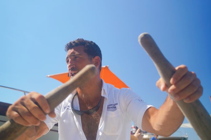 手漕ぎボートに乗り換え、洞窟まで。船頭さんかっこよすぎ!