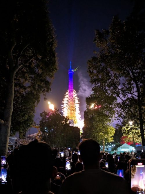 その後、夜のパリ祭(フランス革命記念日)へ。ちょうど7月14日がフランスの革命記念日で、エッフェル塔の前でのフェスティバルに参加することができました。凄い人の多さでしたが、なんとか場所取りも成功。夜の綺麗なエッフェル塔を眺め、コンサートなどもやっていて、多くの人で賑わっている雰囲気も味わえて待ち時間も楽しかったです。23時からエッフェル塔に花火があがった時は大感動でした!パリの記念日に重なり、貴重な体験ができ良い思い出になりました。ただ、帰りも一斉にみんな帰るので、駅近くは人でいっぱいに!地下鉄1本で帰れるホテルにしてよかったです。