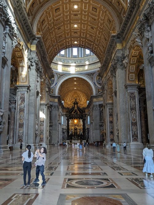 4日目は朝一でバチカン市国へ。朝7時くらいに到着しました。「サン・ピエトロ大聖堂」は絵画・銅像・高い天井までびっしり装飾されていて、人が作ったとは思えないほど綺麗な場所で、その大きさ美しさに圧倒されました。ここでもめちゃくちゃ感動しました! 寺院の上まで登れて、上から綺麗な景色も見られました。その後、予約していた「バチカン美術館」に行き絵画鑑賞を楽しみました。すごい長蛇の列でしたので、予約されることをおすすめします!