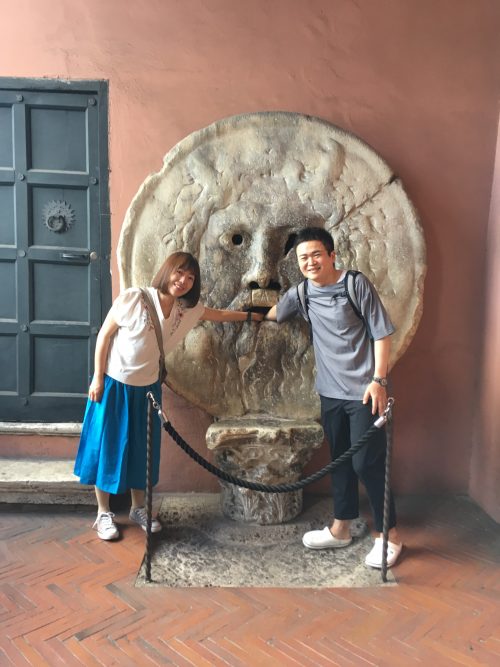 4日目は真実の口へ。教会へ歩いていく途中、古代ローマ最大の競技場跡であるチルコ・マッシモが見えたので、立ち寄ってみました。パラティーノの丘も見え、とても気持ちが良いスポットでした。真実の口では、15分程並んで、お決まりの写真が撮れました!