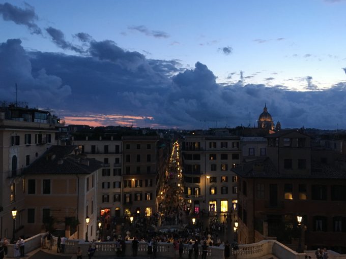 サンタンジェロ城を眺めながらナヴォーナ広場へ。有名な噴水を見学し、次はパンテオンへ。内部ではクーポラの天窓から注ぐ神秘的な光に感動しました。この後歩いてトレヴィの泉へ。ちょうど夕方のライトアップが始まり、何とも幻想的な光景でした。しかし、とにかく人が多すぎて噴水へは近づけず…(泣)。コイン投げはこの日 結局できず(残念!)、そのままスペイン広場へ移動しました。こちらもたくさんの人で溢れかえっていましたが、夕暮れ時で街が色づき始める時間帯で素敵でした。