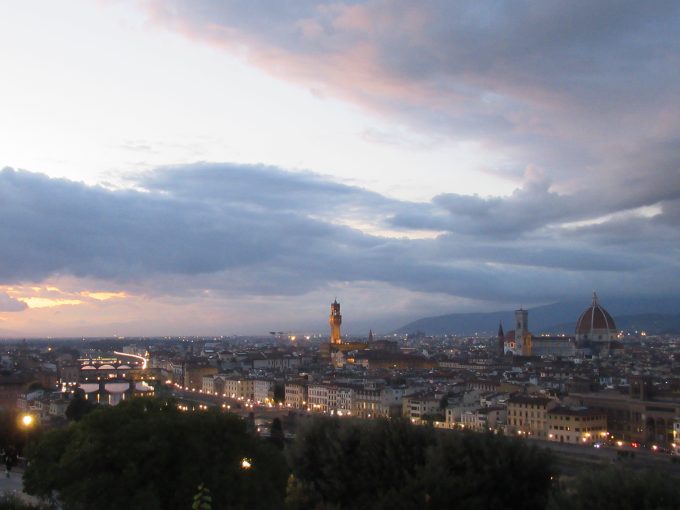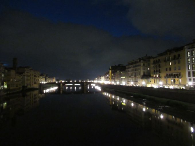 チェックイン後、市バスでミケランジェロ広場へ。日の入り時間には間に合わなかったのですが、空が徐々に暗くなってフィレンツェの街灯やアルノ川沿いのイルミネーションが点き始める時間帯で、夕焼けから夜景に変わっていく、言葉では表現できない色の街の風景に魅せられました。アルノ川沿いを通り、ヴェッキオ橋やシニョリーア広場などをゆっくり歩きながら帰ってきました。街全体が「屋根のない美術館」と称されるフィレンツェ。まさにその通りで、どこを見ても本当に素敵でした。