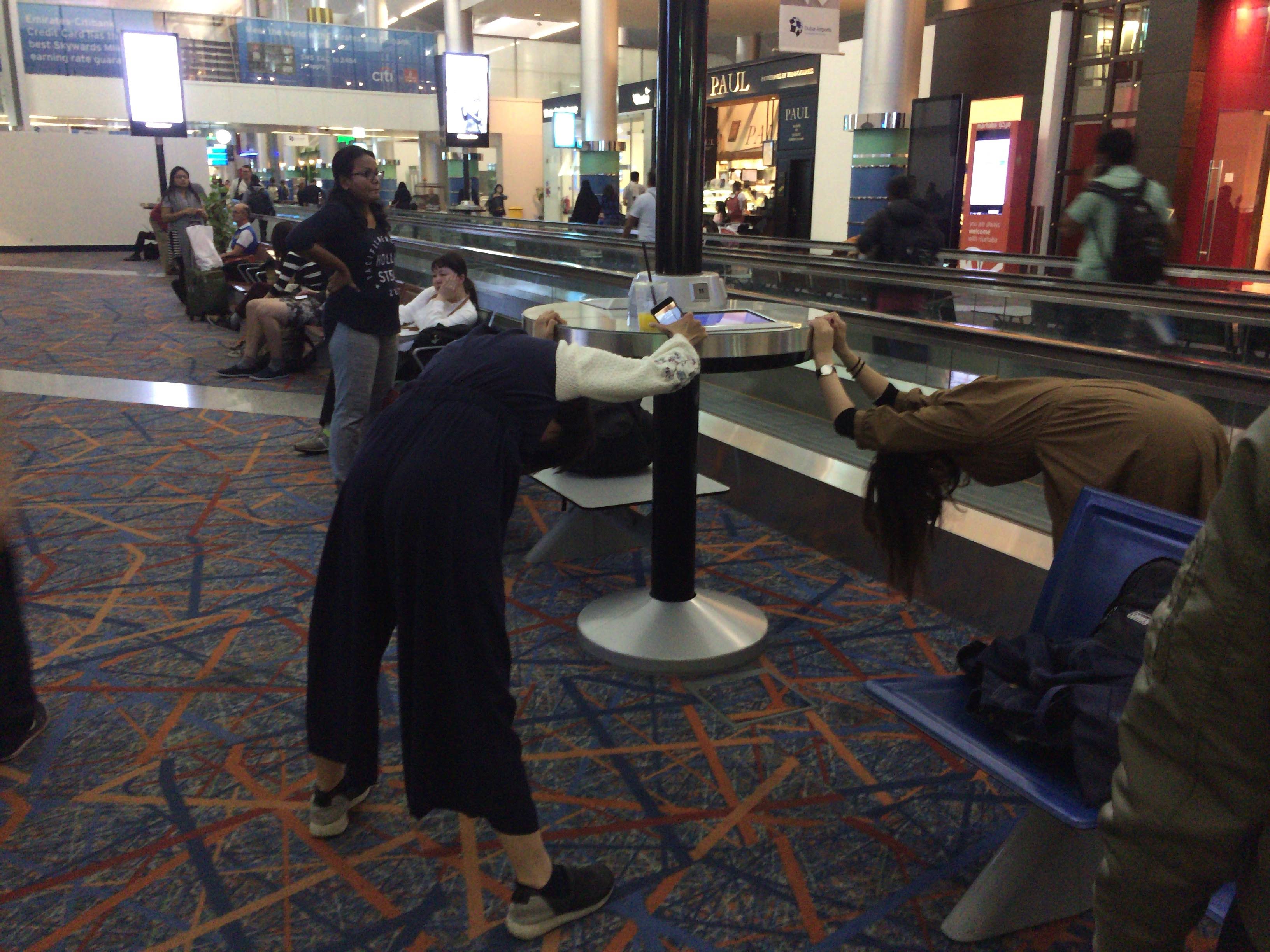 ドバイ空港でストレッチ!長距離移動はつらいですね!