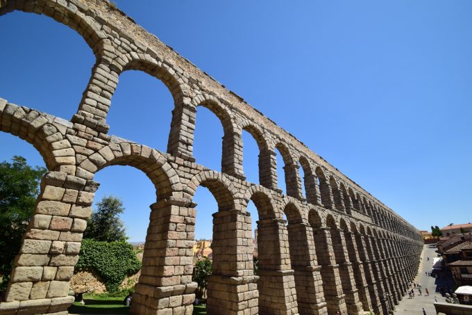 次のセゴビアへは標高1000m越えで、真夏でも日陰は特に涼しかったです。大きな水道橋に感激し、たくさんの石が組み合わさって接着剤なしで成り立っていることにとても驚きました。まずは遅めの昼食(スペインでは14時頃~昼ごはんらしいので普通の時間帯ですが)に仔豚の丸焼きコチニージョを戴きました。産まれて2ヵ月以内のミルクのみで育った子豚で、臭みがなく食べやすかったです。その後、白雪姫の舞台となった、世界遺産「アルカサル」を見学しました。断崖絶壁の場所にあるお城の屋上に上がって眺めた、360度の絶景は忘れません!