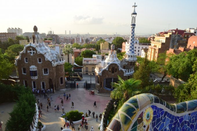 グエル公園「波打つベンチから見るお菓子の家とバルセロナの街並み」