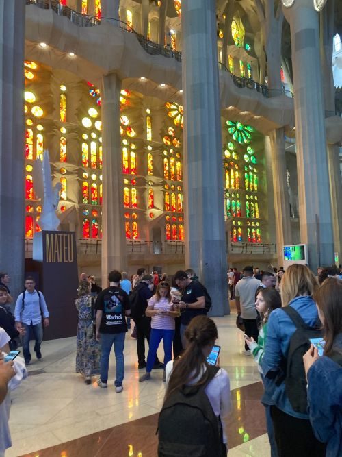 前回訪問した際、サグラダファミリアは外観のみで中には入りませんでした。今回はガイドさん付きで入場です。色々と細かく説明していただきました。人数制限をしているので、そんなに混み合った印象もなく、巡ることができました。コロナ明けで世界各国の観光客がいらっしゃいましたが、アジア系の人は少ない印象でした。中に入って、まず天上の高さに驚きました!高さは45mあるそうで、十何階のビルがスポッと入る高さだそうです。東側に青、西側にオレンジのステンドグラスが貼られており、差し込む光でとても綺麗でした。エレベーターで上にも登り、上からバルセロナの美しい街も一望できました。近くで下から彫刻を見上げることもでき、繊細な作りを間近で確認できました。下りは急な小さな螺旋階段で、手すりが片側にしか付いておらず非常に怖かったです(苦笑)!