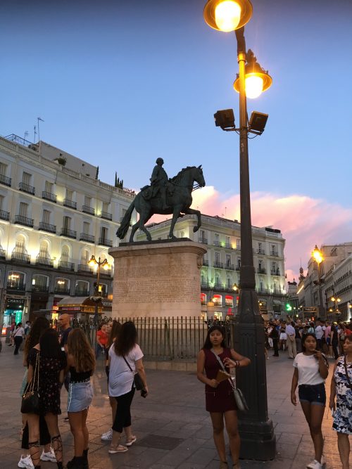 グラナダからAVEで約3時間半の鉄道の旅。18時過ぎにマドリードへ到着しました。マドリードの滞在先ホテル「オペラ」は、とにかく建物も部屋も綺麗!1階には素敵なバル&カフェもあり、最高でした!オペラ駅の目の前で、その名の通りオペラ劇場があり、オペラ劇場の向かいには「スペイン王宮」が!なんとも素晴らしい立地です!そして朝食にチュロスが出たのも素敵でしたね!この日は、マドリードの中心地「太陽の門(プエルタ・デル・ソル)」という広場へ。夜の早い時間でしたが、人・人・人!まるで渋谷のハチ公前のような人だかり。大道芸もあるし、マドリードの紋章である「くまといちごの木」の像もありました。