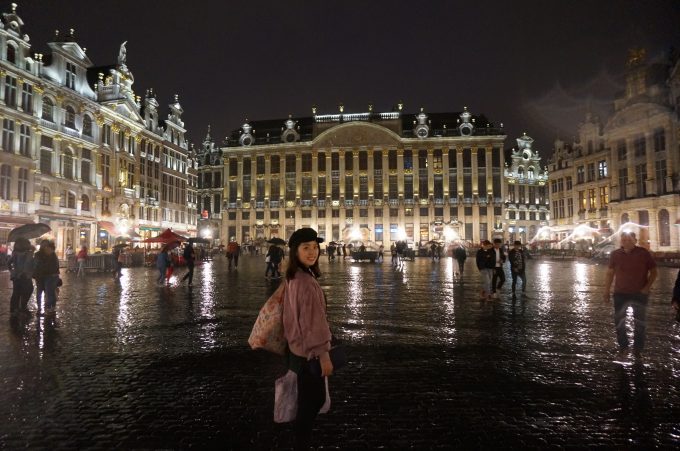 途中また雨が降って来たので、一度ホテルに帰り、雨が止んでからグラン・プラスという大きな広場へ。「世界で最も美しい広場」と言われる広場でいつ行ってもきれいなのですが、特に雨の日の夜は、雨に濡れた地面が広場の周りの建物の光を反射してきれいでした。グラン・プラスは雨の日の夜がおススメです!路上でブレイクダンスも始まりました。パンとサラダを買って、夜ご飯はホテルで食べることにしました。