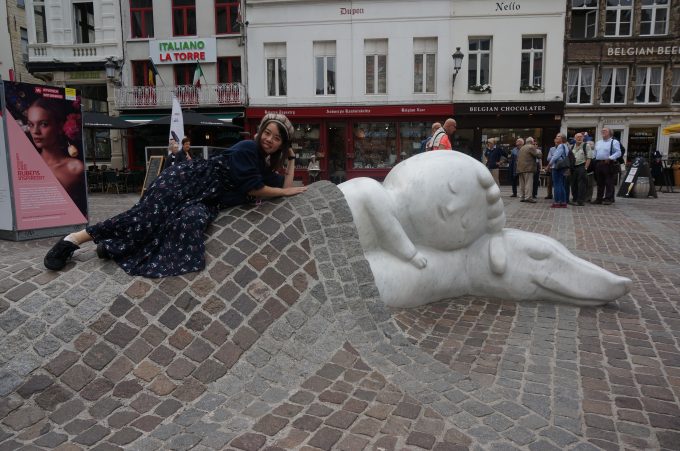 ギャルリー・サンチュベールという高級小物やチョコレート屋さんなどベルギーの人気店がたくさんが並んでいる商店街へ向かいました。アーケードが美しい商店街の中を見て歩き、そのままぶらぶら歩きながら、ベルギー生まれの人気キャラクター・タンタンが描かれた壁画を探してみたりしました。