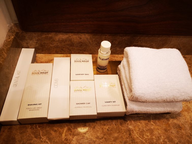 アラビアンな雰囲気と伝統を大切にしたデザインとはいえ、トイレの便座が四角い、という以外は、とても使い勝手の良いバスルームです。バスタブはありませんがシャワーブースには、シャンプー、コンディショナー、シャワージェルのフルセット。そしてアメニティも海外でありがちな「歯ブラシがない!」ショックに襲われることなく思わず「良かった」とポツリ。イギリスのコスメブランド、エレミスのボディローションもあり、女性でも大満足の充実度でした。