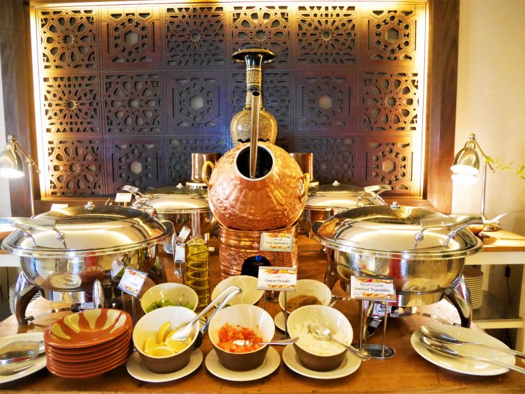 ホテルの朝食は毎日「AL TERRACE」でいただきました。見てください!こするとランプの妖精「ジニー」が出てきそうな中東らしいディスプレイ!