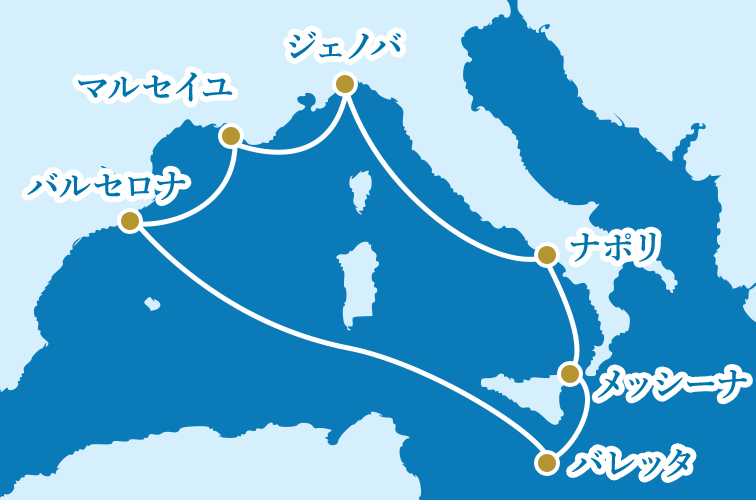 出発地スペイン・バルセロナ⇒フランス・マルセイユ⇒イタリア・ジェノバ⇒ナポリ⇒メッシーナ⇒マルタ共和国