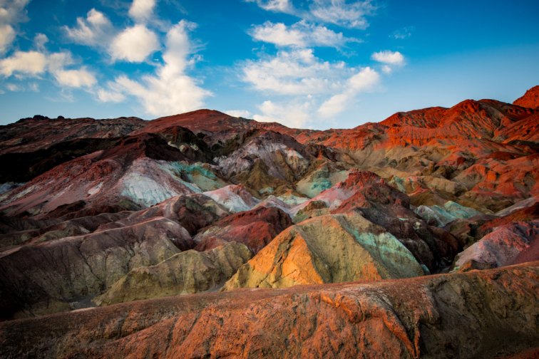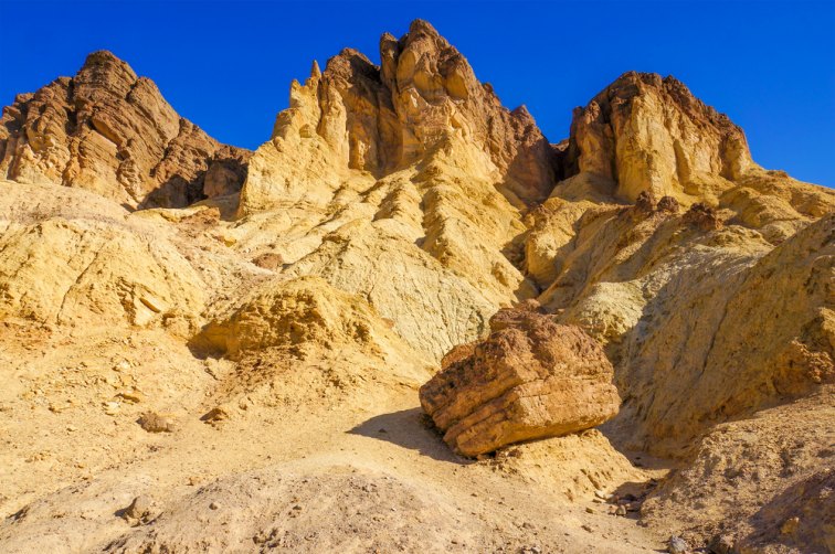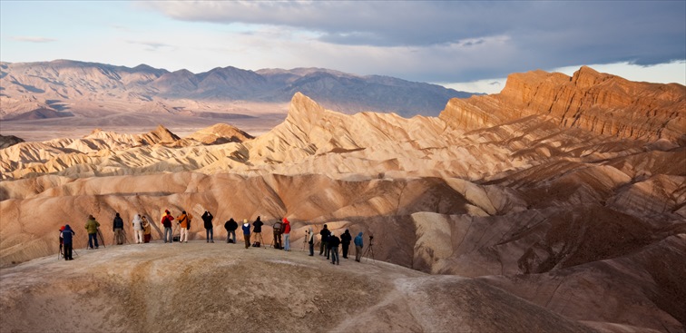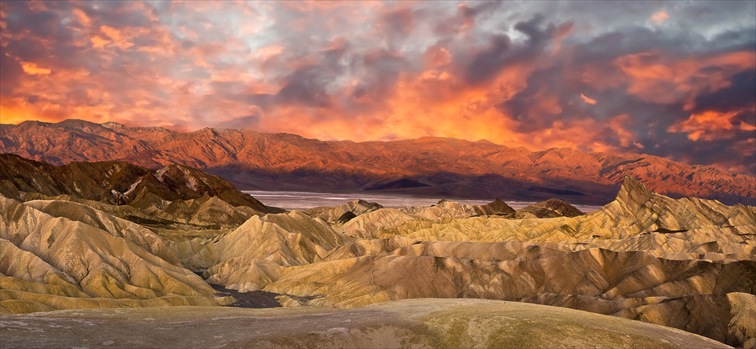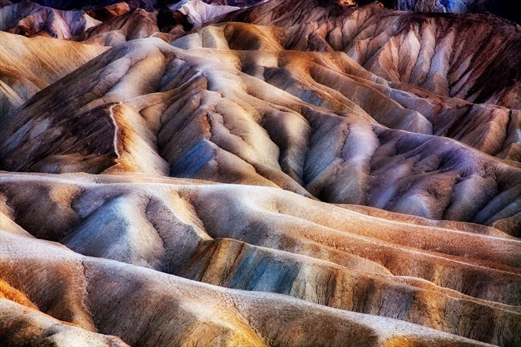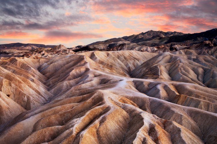 波打つ岩が幾重にも重なった岩山の「ザブリスキーポイント」は、日が昇るとゴールドに輝く事から「天然のアート」と称され、デスバレーの絶景ポイント中でも常に人気のエリア。