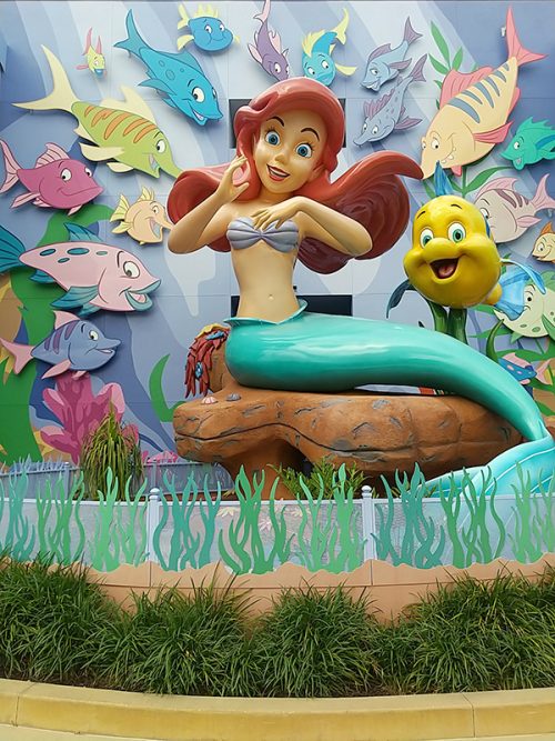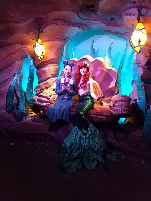 食後はアリエルとグリーティング。すっごく顔が小さくてキレイでした! ホテルのお部屋がアリエルなんです、など会話ができてうれしかったです。隣にあるアトラクション「アンダー・ザ・シー:リトル・マーメイドの冒険」にも行きました。設定が海の中の演奏会、本当に海の中にいるような素敵な世界観を楽しめました!