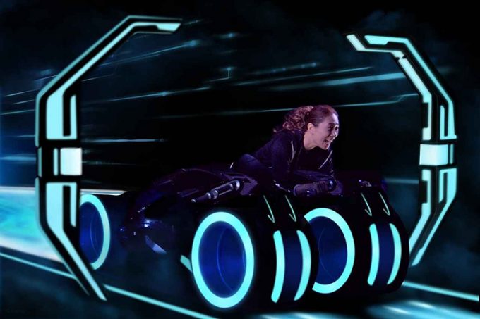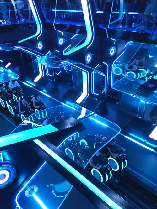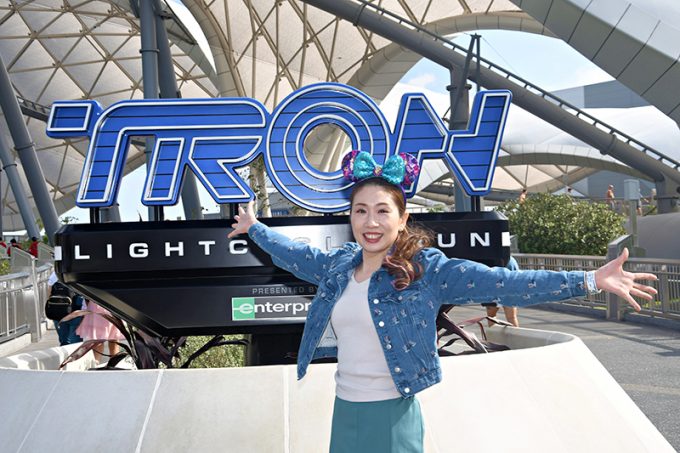 その後、ぶらぶらと散策しながら写真を撮って過ごしてから、最新アトラクション「トロン・ライトサイクル・ラン」に向かいました。朝の7時にアプリでエントリーし、無事予約ができたのです。疾走感がものすごくて、最高に面白いアトラクションでした!大興奮です!!