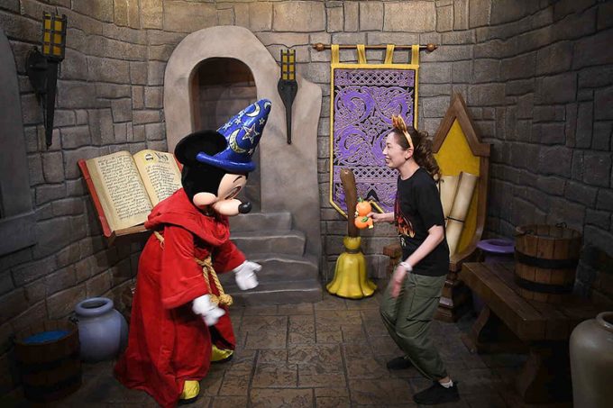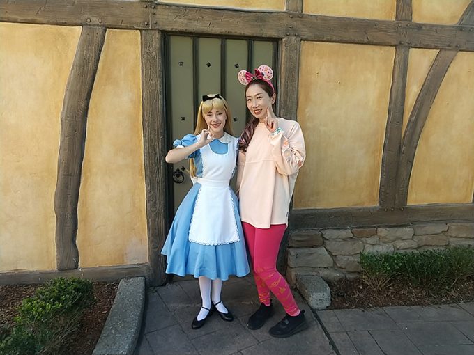 イギリス館に行ってお店に入って写真を撮ったり、写真スポットで写真を撮ったりの繰り返し。出発前にメモリーメーカー2万円を購入しておきました。これを購入すると写真撮り放題なんです。どのパークにも写真スポットがたくさんあって、マジックバンドを係の人にかざすと撮影してくれます。データでアップしてくれるので、ひとり旅でも写真に困らずでした! イギリス館でのグリーティングはアリスと。英語を話せないと伝えると、先導して会話してくれてみんなとっても親切です!