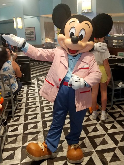 いったんディズニー・ハリウッド・スタジオの外に出て、ディズニー・スカイライナーに乗り、ディズニー・リビエラ・リゾート内にある「トッポリーノ・テラス」というレストランへ向かいました。キャラクターダイニングを予約しておいたのです。ミッキー、ミニー、ドナルド、デイジーと会えました。朝食ですが、最終の12時過ぎの回を予約したので、時間的には昼食です。イタリアがテーマのホテルの中にあるレストランなので、おしゃれな感じ。ミッキーたちもイタリアの音楽に合わせて踊っていました、衣装も可愛くて素敵!