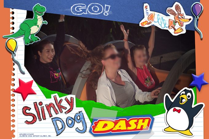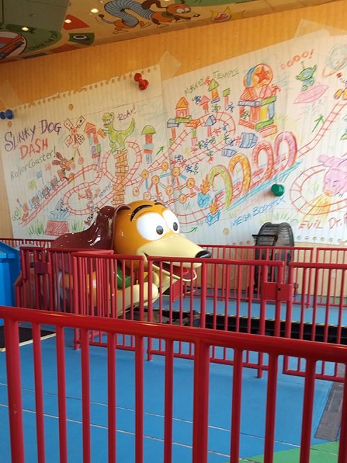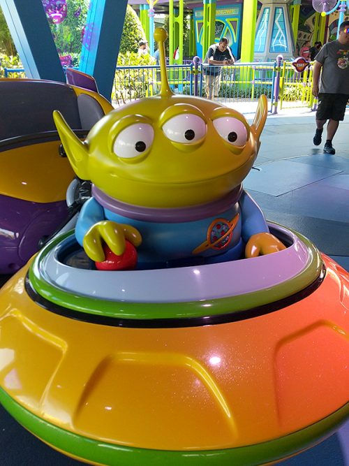 トイ・ストーリーランドに移動して、「エイリアン・スワーリング・ソーサー」という、リトル・グリーン・メンの乗り物に乗りました。次に「スリンキー・ドッグ・ダッシュ」へ。人気のあるコースターで、見た目が可愛いのでなめてかかってたら、結構スリルがありました! 子供向けにしてはちょっとハードな印象でしたが、大人には怖いというより楽しいくらいの怖さで面白かったです!