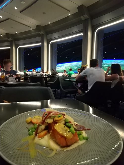 昼食は、最近できたばっかりのレストラン「スペース220」に行ってきました。搭乗券が渡されて、エレベーターに乗って宇宙に行く設定です。レストラン着いたら全面宇宙のすごい空間でした! 食事はテーブルサービスで、前菜とメインが出て、どれも美味しかったです。最新レストランなので、運よく予約できてよかったです。ただ、アミューズメント的な目的で言うと、キャラクターグリーティングがないし、一度来たらもういいかなという感じでした(笑)。