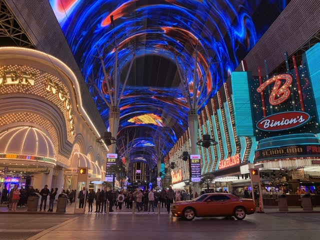 ホテルに荷物を置いてから、ニューヨークではチキンを食べていなかったのでブルーリボンフライドチキンでご飯をしました。そして、ダウンタウンのフリーモントストリートへ。ラスベガスは観光地が1か所にまとまっているのですが、ここだけ少し離れたところにあったので、バスで行きました。