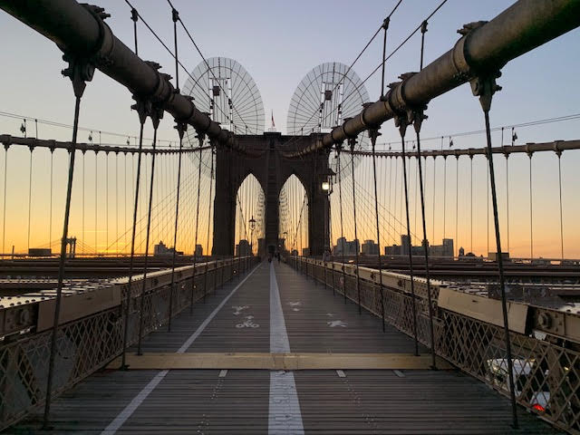 日の出前の5時半に早起きして、タクシーでブルックリンブリッジに向かい、ダンボ側に向かって日の出を見ながら歩きました。ダンボ地区はレンガ造りで、暖色の雰囲気が漂うエリア。マンハッタン側にいるときは暗かったのですが、どんどん明るくなっていった様子が写真を見返すとわかります。