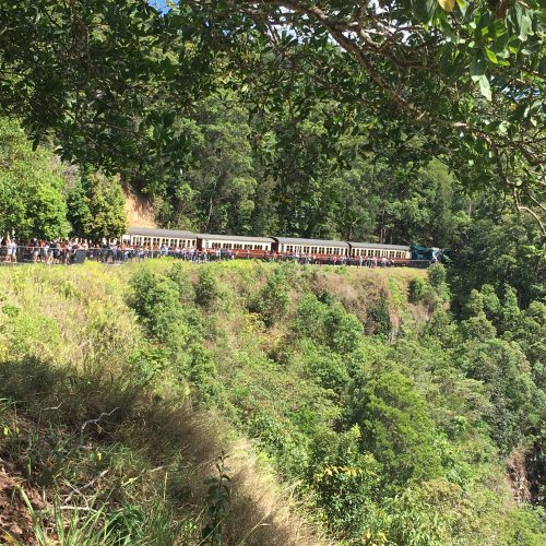 2日目はキュランダです。前回と同様にオプショナルツアーを申し込む予定でしたが、たまたま機内で隣になった子が自力でキュランダに行くというので付いて行きました。前回は行きはスカイレールで、帰りはキュランダ高原鉄道だったのですが、今回はその逆。私は今回のように行きが列車で、帰りをスカイレールにする行き方をおすすめします!といいますのも、キュランダ鉄道は「世界の車窓から」で長らくオープニングに使われていたほど日本では有名ですよね。車窓からの景色を少しでも長い時間堪能したいのに、帰りが鉄道だと疲れてしまっていつの間にか寝てしまうんです…元気な往路のときにキュランダ鉄道に乗れば、車窓からの絶景を目に焼き付けることができますよ!