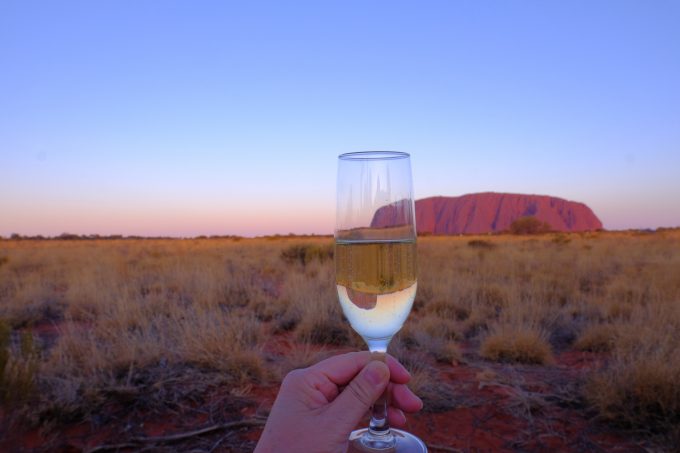 いよいよエアーズロック!初めて近くで見るエアーズロックに大興奮でした。ツアーガイドの方が写真を撮るのがとっても上手く、シャンパングラスを持って写真を撮ってもらうとガラスの中には逆さウルルが…!だんだん暗くなるエアーズロックに感動しました。