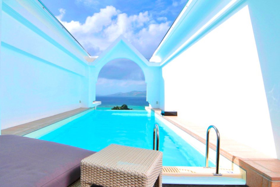 そして、お部屋の中にある階段を登ると真っ白な壁で囲まれたプライベートプールがあります。インフィニティプールになっていて、プールの先には海と空が広がり、まさに天国にいるような気分を味わうことができます。