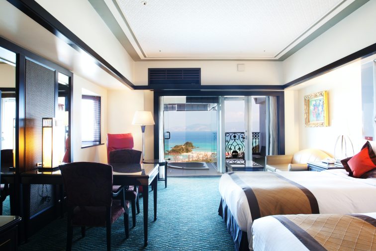 ザ・ブセナテラスには全13カテゴリーのお部屋があります。女子旅でおすすめなのが、テラスから海を臨める「デラックスナチュラル オーシャンビュー」がおすすめ!バスルームの引き戸を開ければ、バスタブからも海が見えます。プランにもよりますが、安いと朝食付きで1泊1名あたり1万円台で宿泊できちゃいます!GoToトラベルキャンペーンを使えば1万円ぴったりくらいになることも!