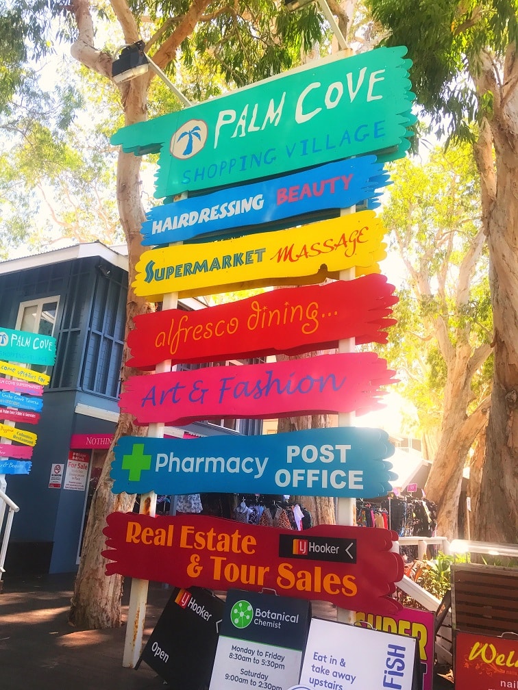 パームコーブは、ケアンズからバスで約1時間のところにあります。パームコーブとは、パーム(ヤシの木)が茂るコーブ(入り江)を意味します。フォトジェニックなヤシの木が並ぶ海岸沿いには、ホテルやおしゃれなカフェ、レストランが軒を連ねていて、ショッピングや食事を楽しめます。カラフルな看板は思わず写真を撮りたくなっちゃうフォトスポットです!