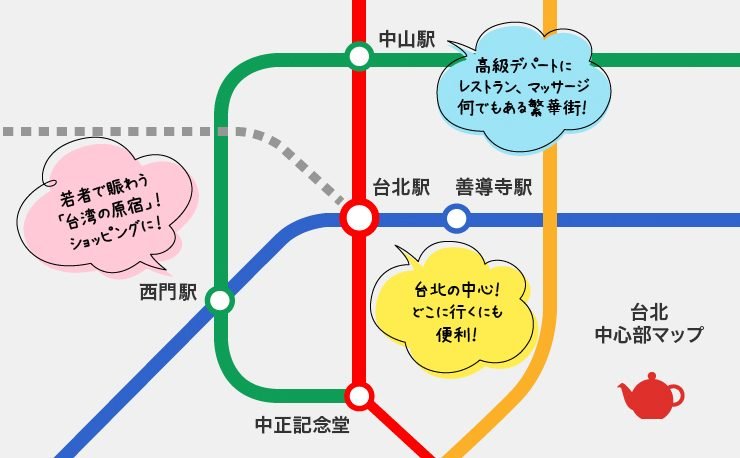 いかがでしょうか?台北の中心部のイメージは掴めましたでしょうか?便利なエリア3つに滞在して、美味しいグルメの食べ歩き、可愛い雑貨探しなど、街歩きを存分にお楽しみください♪