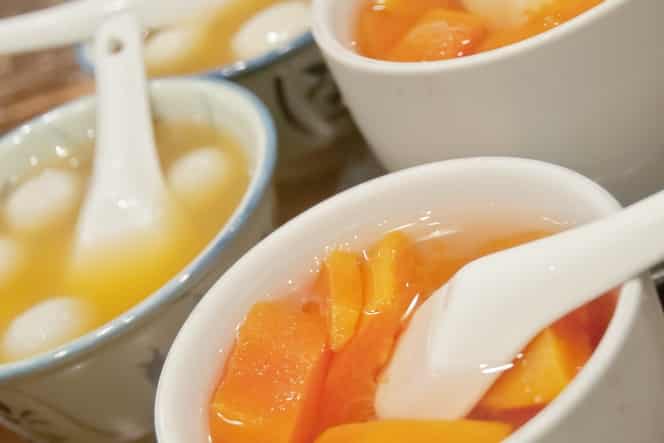 写真左側のものは「寧波薑汁湯丸(ニンボジャンズタンワン)」といって、甘めのジンジャーティーの中に黒ゴマ入りの白玉が入っているもの。写真右側は、パパイヤのスープデザートです。どちらも、日本では見慣れないデザートですよね。