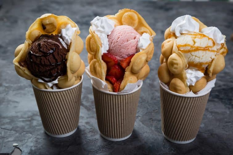 まずは腹ごしらえ!ホテルに荷物を置いたら、さっそく街歩きに繰り出しましょう。まずは、「エッグワッフル」をご堪能あれ!丸い部分の表半分が空洞で裏半分がもっちりしたパンケーキです。例えるのであれば、外側がパリッとした羽根つきのベビーカステラのようなもの。生地に味が練りこんであったり、アイスやフルーツを巻いてあるメニューもあります。ミシュランの「ストリートフード部門」に掲載されたこともあるという、Mammy Pancake(マミーパンケーキ)がオススメです。