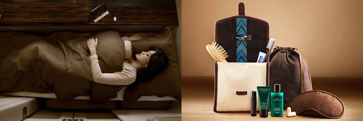 ファーストクラスの座席は、180度のフルフラットベッド仕様です。就寝時は、贅沢なマットレス・ 掛け布団・枕で、究極の寝心地をお楽しみください。機内用スリッパ、男性・女性用の部屋着、『エルメス』製の豪華なアメニティキットなど、すべてにこだわり一級品をご用意しています。