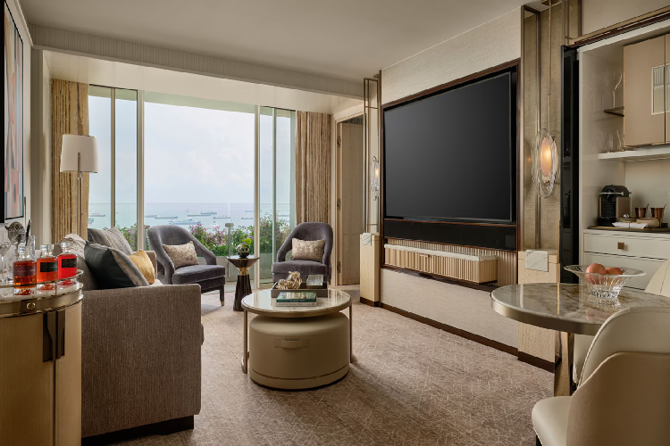 50階より上に位置する豪華なマリーナスイートからは、ガーデンズ バイ ザ ベイとシンガポール海峡の地平線までを眺められます。