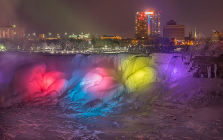ナイアガラの滝でのもう1つの楽しみが、日没後から始まるライトアップです。冬の間は、凍り付いたナイアガラの滝がライトアップされ、昼間の壮大な自然美とは異なるロマンチックな姿を見せてくれます。
