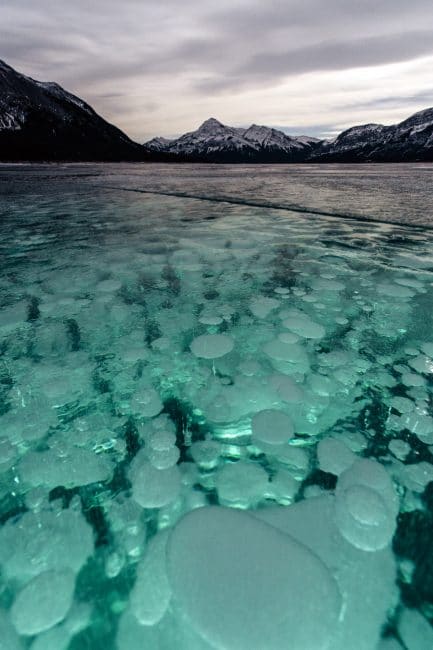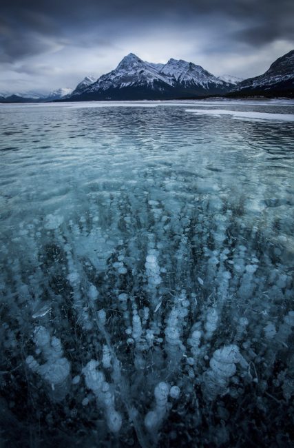 カナディアンロッキーにあるアブラハム湖で、1~3月頃に見ることができるアイスバブル。透明度の高い湖の底から発生する気泡が、湖面に上る前に凍ってしまったもの。気泡の正体は、湖底に自生している植物が放つメタンガスだと考えられています。
