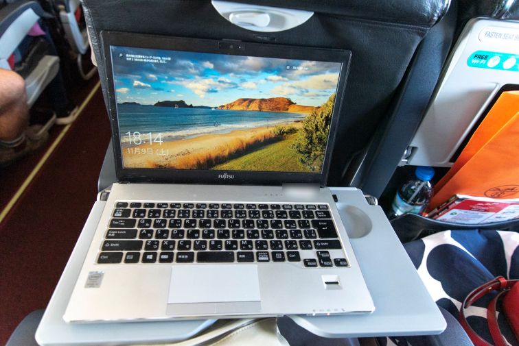 LCCなので正直なところ、狭さは否めません。机を広げてみると13インチのパソコンを載せて、少し左にずらせばマウスを動かせる程度の大きさがあります。食事はもちろん、書きものや読みものをする場合も差支えありません。大柄な方でピッチが広い方が良い場合は、事前に座席を指定しておくと安心です。