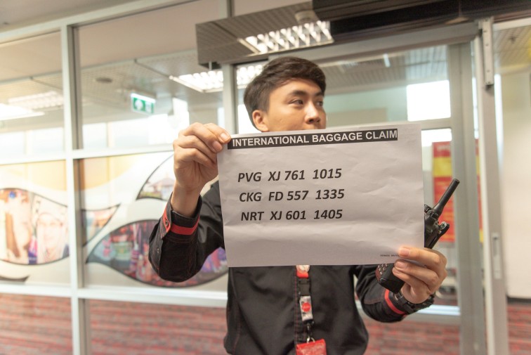 目的地(今回はチェンマイ)に到着後、荷物を受け取りますが、場所は「インターナショナル(国際線)」用の荷物受け取りレーンへ行かなくてはなりません。胸に貼り付けた赤いシールによって、スタッフが乗り継ぎをする乗客を見つけて声をかけてくれます。シールを張り付けていないと、気づかずに国内線の荷物受け取りの方へ流れて行ってしまう可能性があるので要注意。スタッフが国内線の乗り継ぎゲートにて、プラカードを持って案内してくれます。