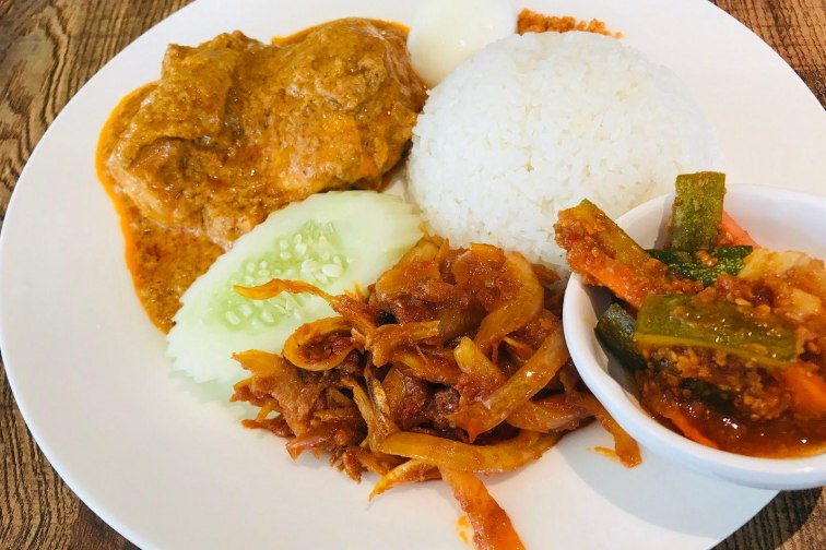 ご飯に添えられる具は店により様々で、 Madam Kwan’s のナシレマにはカレー風味のチキン、卵、きゅうり、揚げた小魚、ピーナッツ、野菜、自家製のサンバルソース(辛味ソース)がトッピングされています。Madam Kwan’s のナシレマはガイドブックにも掲載されるほど王道のナシレマなので、ナシレマデビューされたい方はぜひここに行ってみてくださいね。
