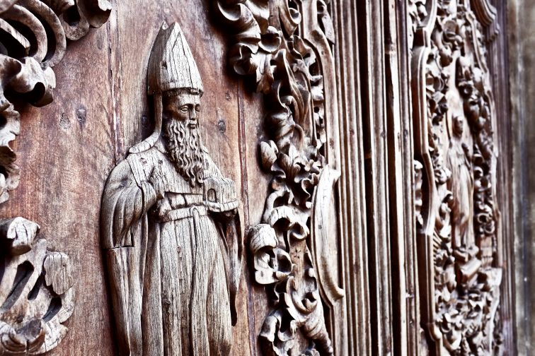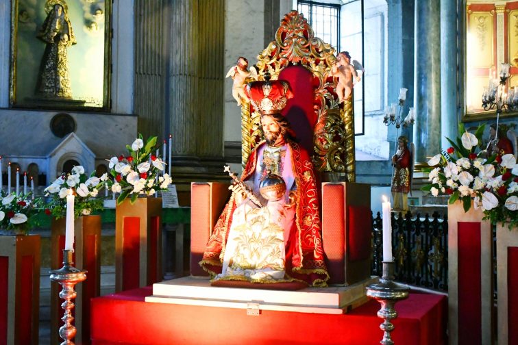 教会の天井をよく見るとぎっしりと花が描かれています。彫刻のように立体的に見えますが、すべて油絵で装飾されたもの。バロック建築ならではのだまし絵的な技法が見られます。花のモチーフはパイナップルで、当時スペインからやってきたフィリップ王が現地のパイナップルを大変気に入っていたのだとか。ちなみに、フィリップ王の名前「フィリップ」と「パイン」を合わせて、フィリピンと国名が付けられたという諸説もあります!